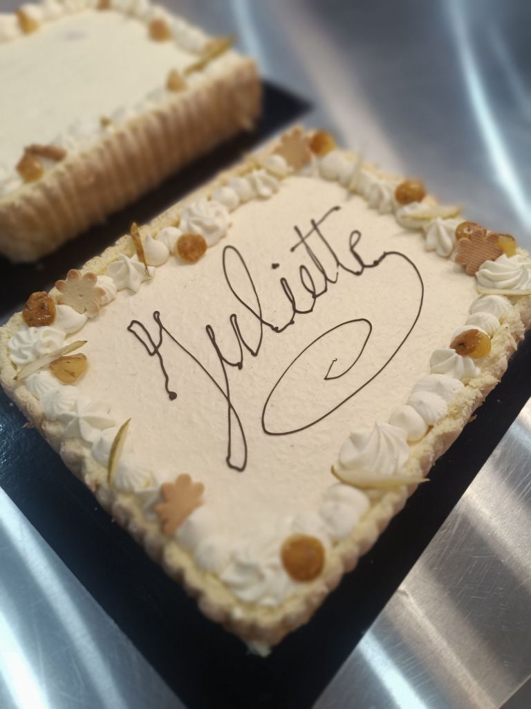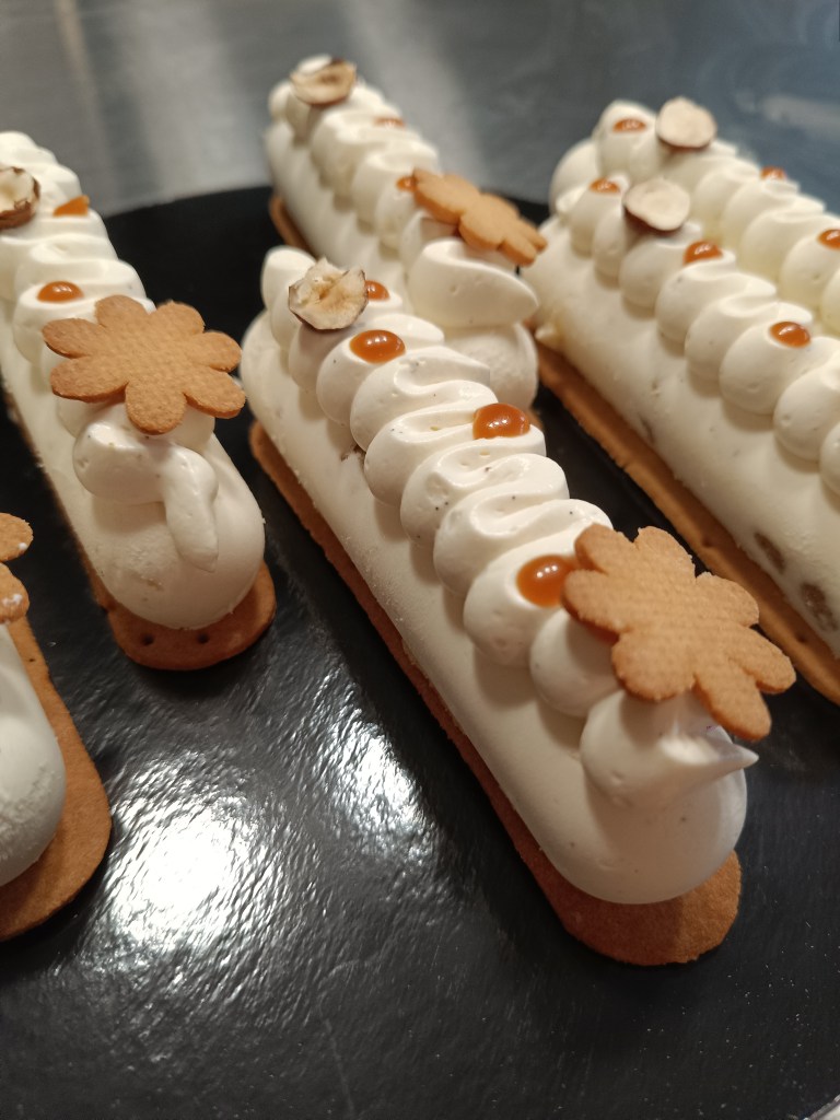 - Vanille caramel : biscuit moelleux à la noisette, Streusel de noisettes, caramel au beurre salé, ganache montée à la vanille