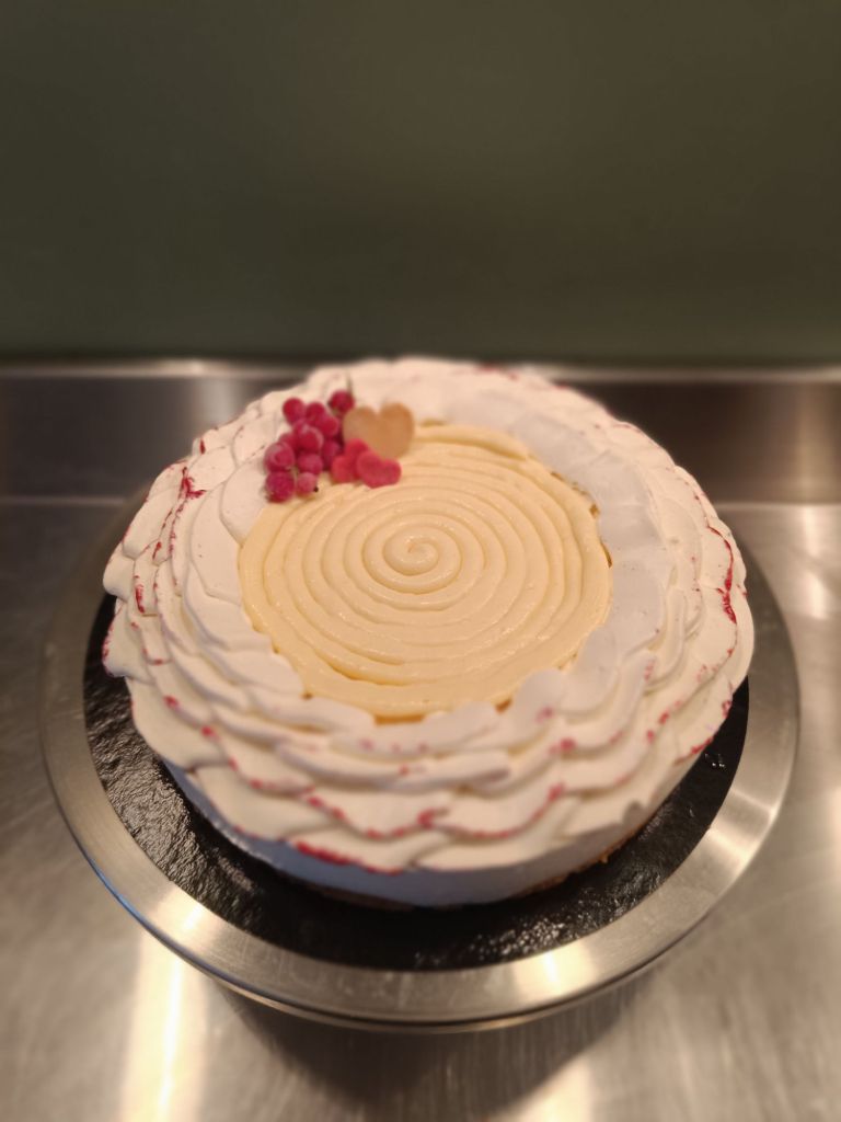 - Vanille framboise : biscuit moelleux à la noisette, Streusel de noisettes, confit de framboise, ganache montée à la vanille
